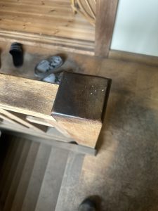 築50年以上の階段手すりの上部です。よく手をかける場所なでツルツルとしてにぶい光沢がでています。下や横の部分と大きく異なります。このようなピカピカはとても品があります。コレは経年良化です。
