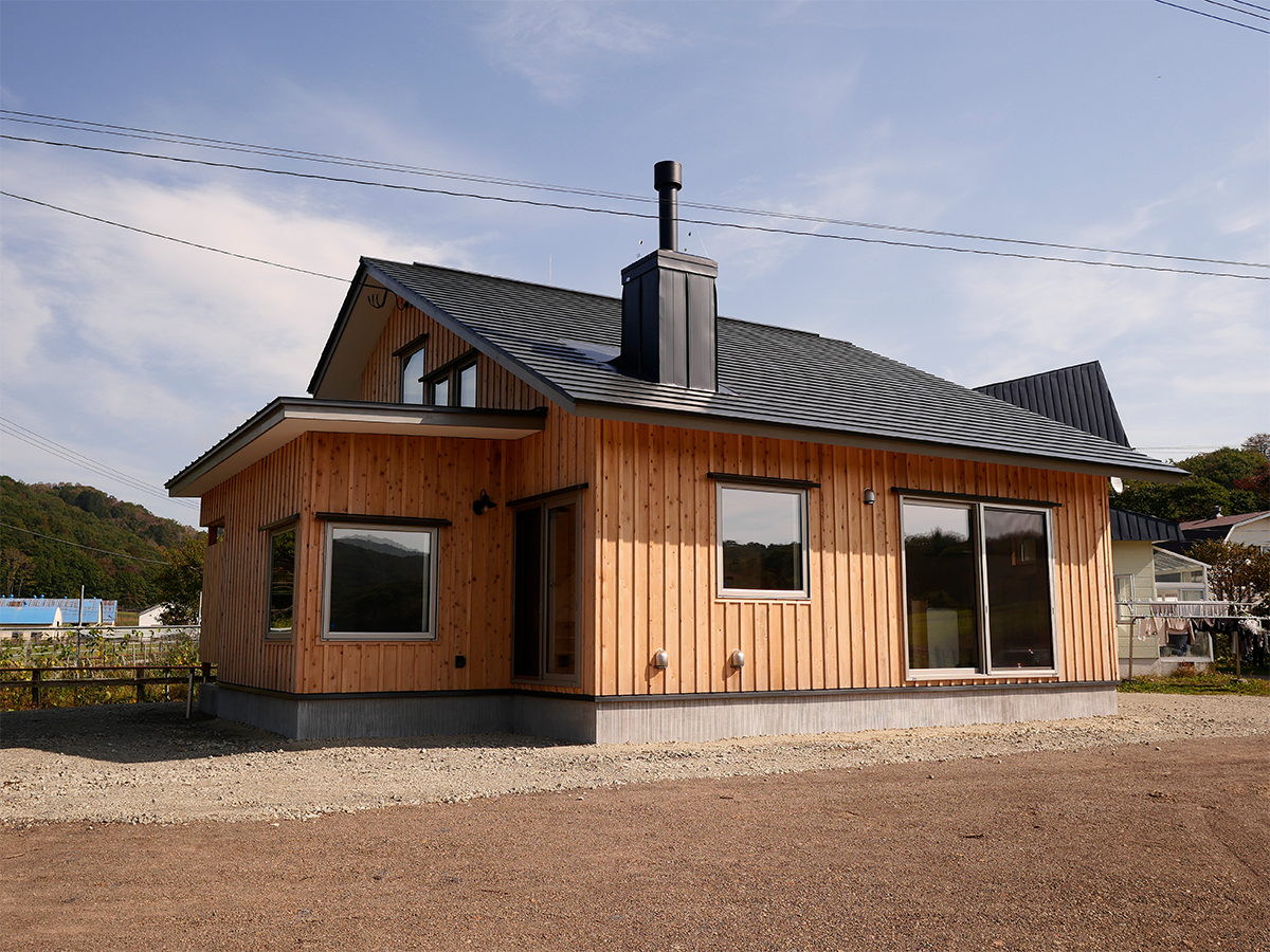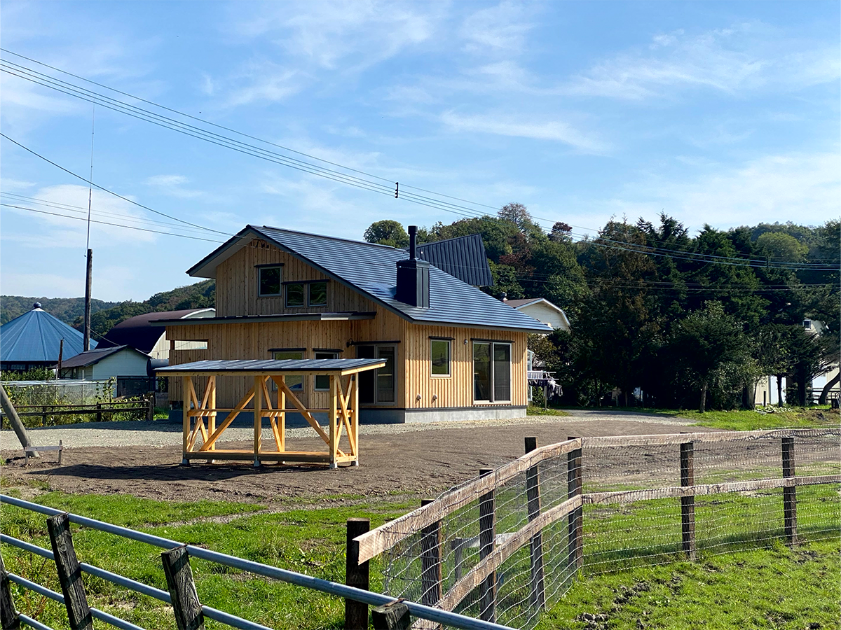 道南杉の外壁と大屋根+煙突でとても牧場の中に調和する外観。パッシブ設計+道路からの視界を考えての配置により、日中もカーテンの要らないイエ。