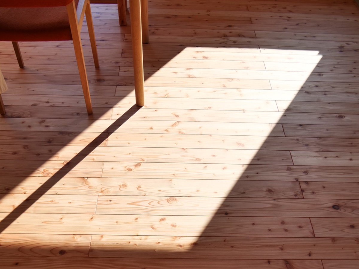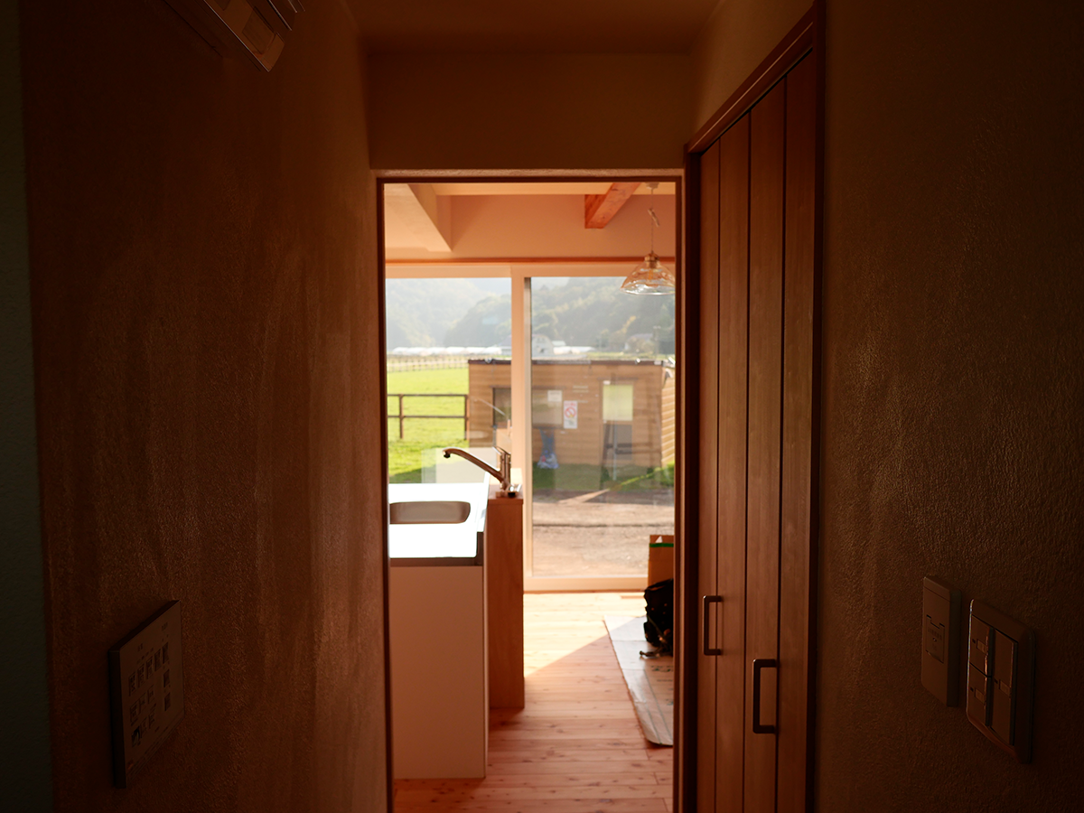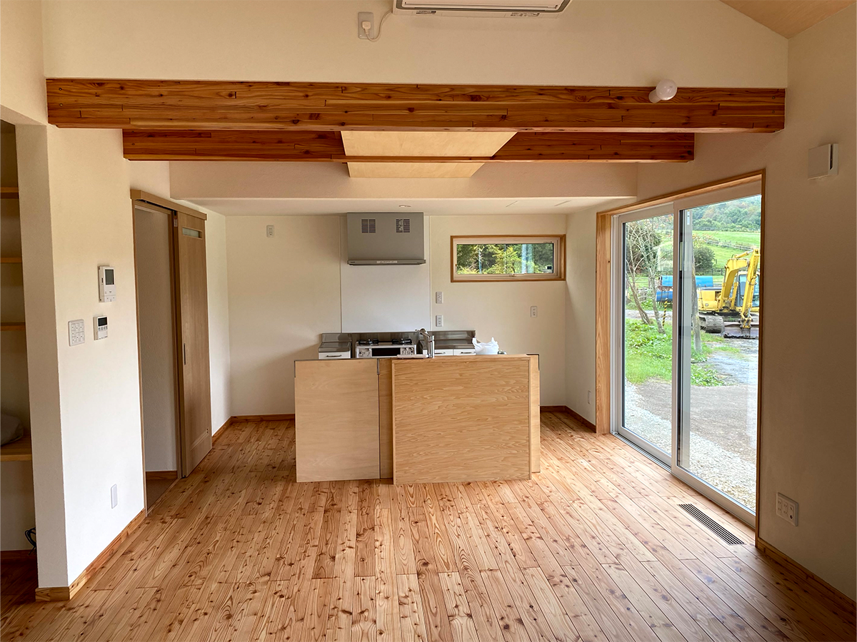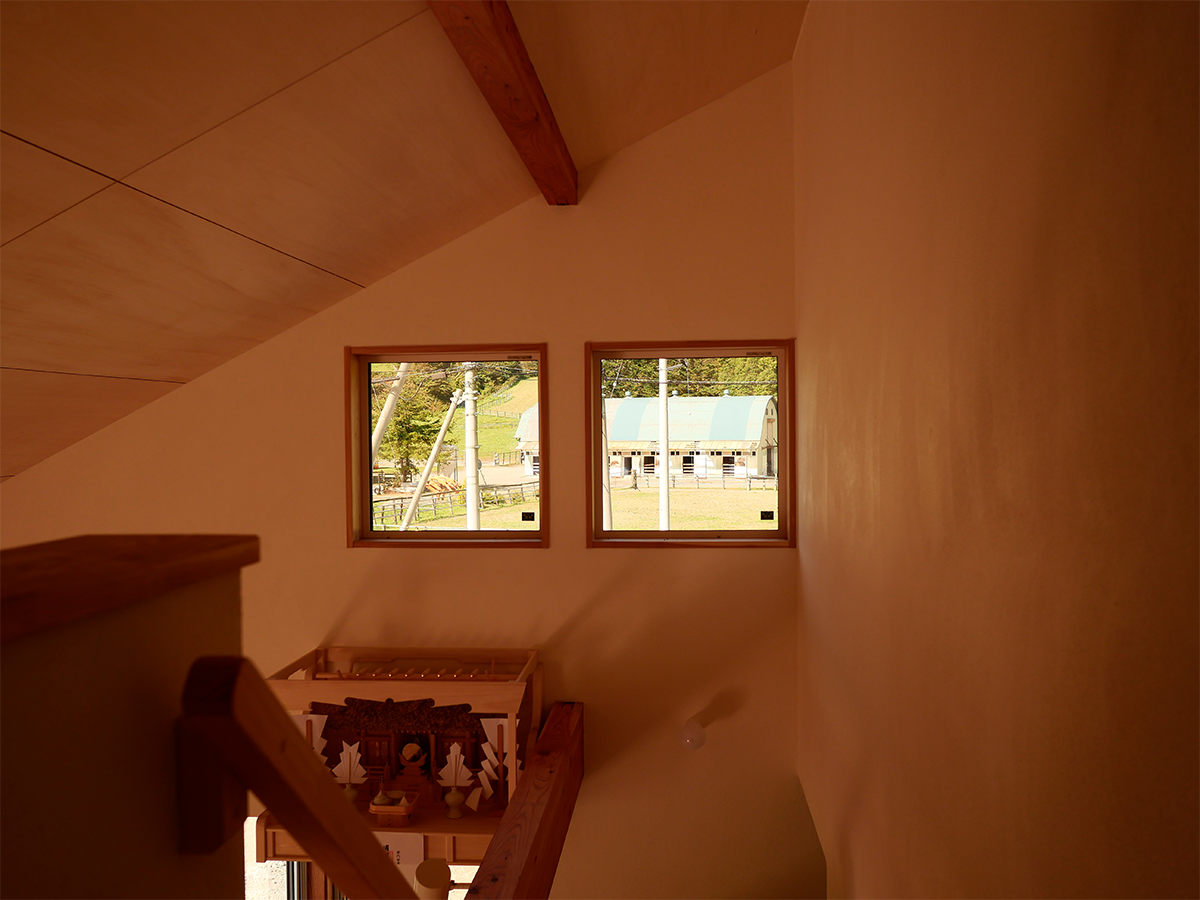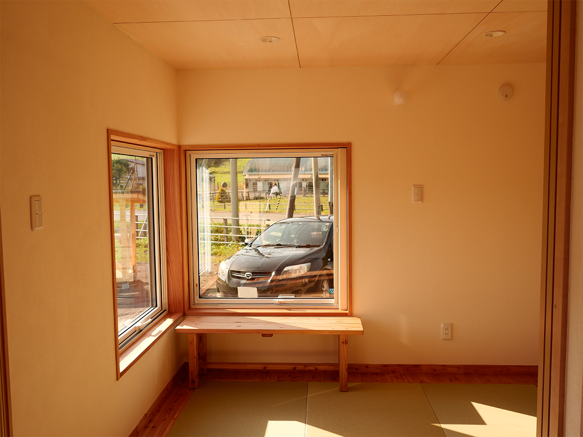 内装は壁はほたて漆喰、天井はシナベニア、床は道産カラマツという仕上げと、南のマドから降り注ぐ陽の光と景色により、内外がつながった空間となりました。