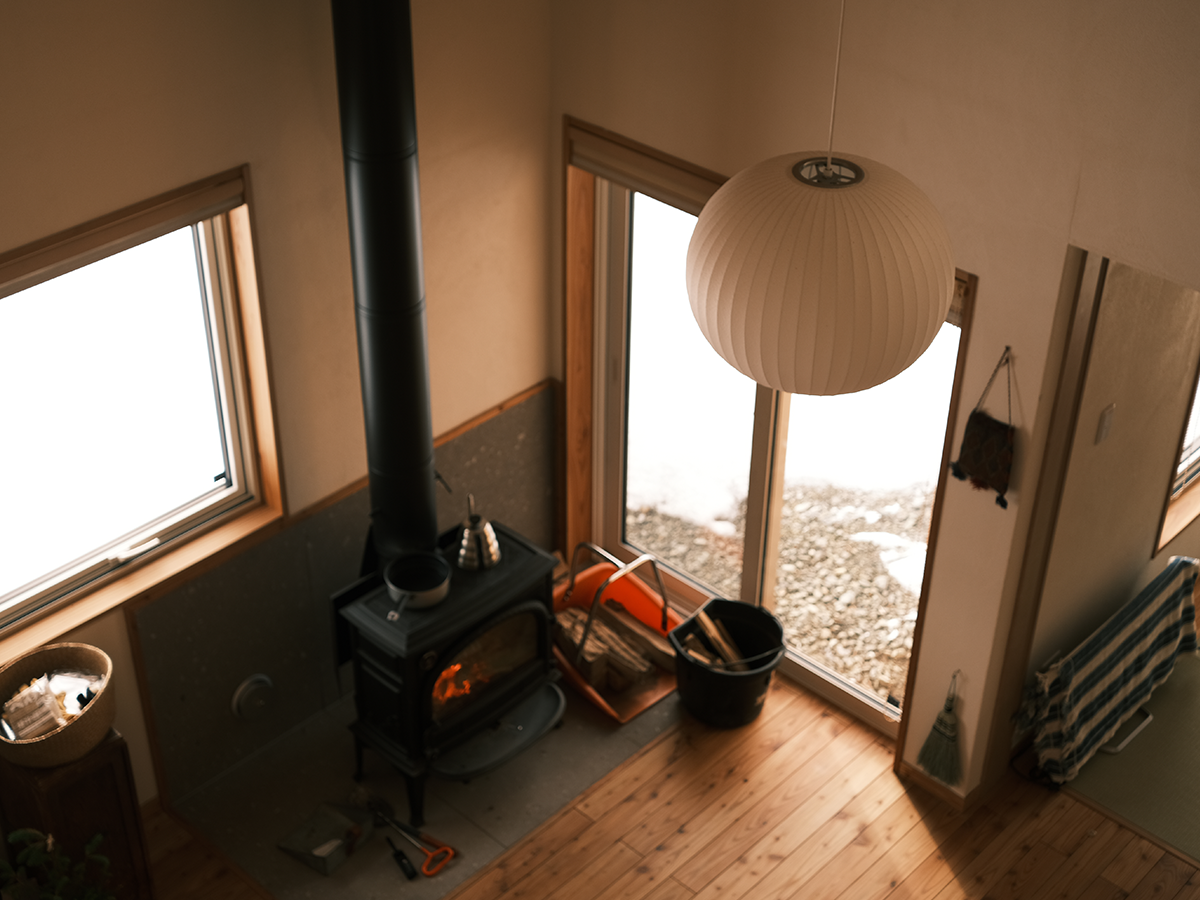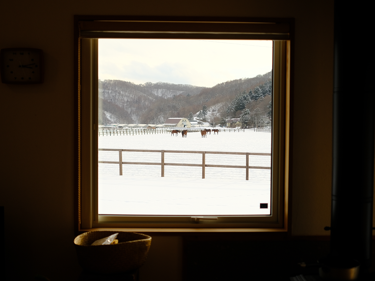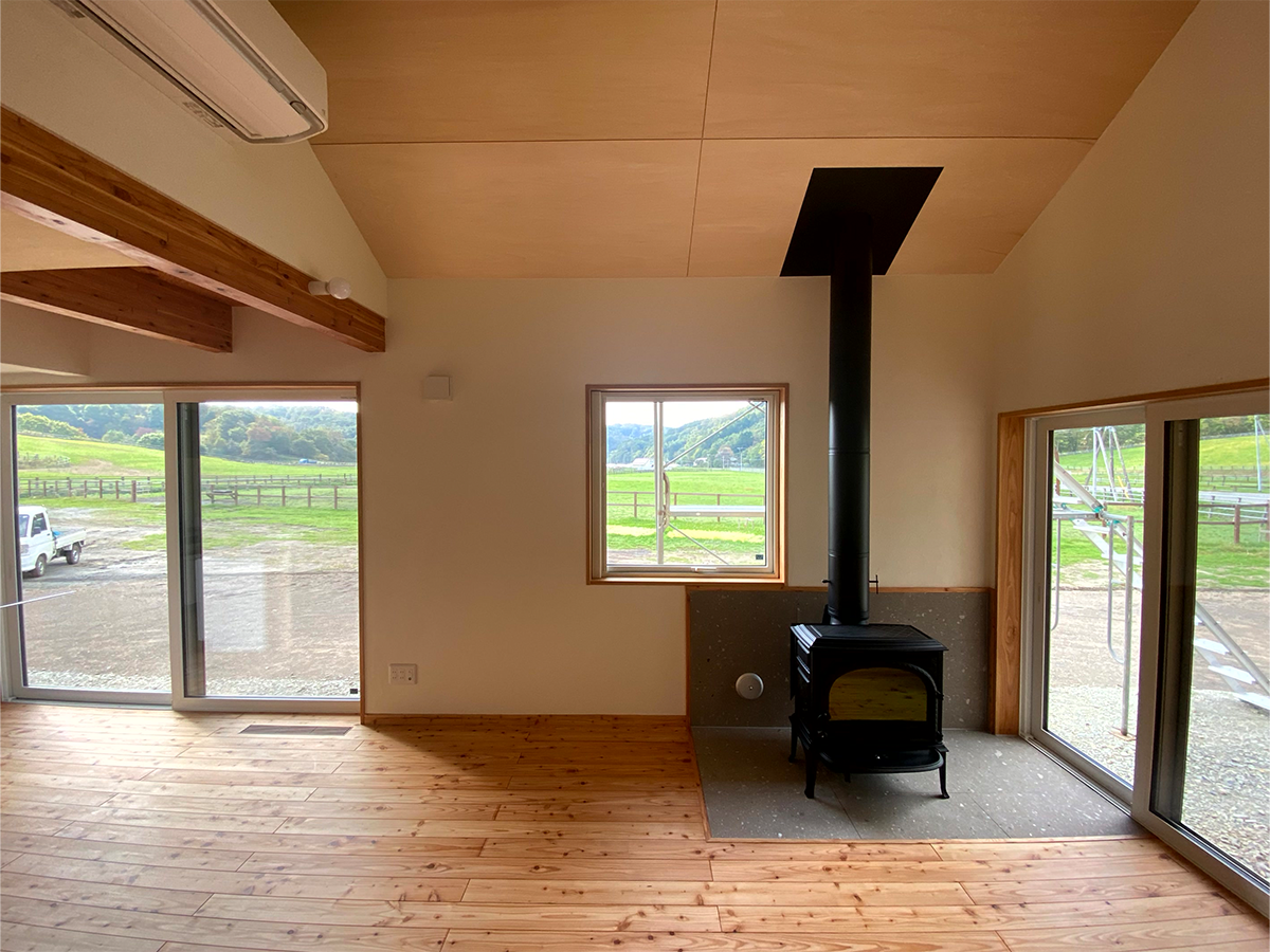 冬は薪ストーブで家中が暖か。そして薪ストーブのまわりに自然と集まる空間。奥様の好きな音楽が流れ、お子さんも居間で遊ぶ。旦那さんはゆったりダイニングに腰掛け、牧場の馬たちの様子を眺めている。そんなまきばの暮らしはこの地域ならではの豊かさであると言えます。