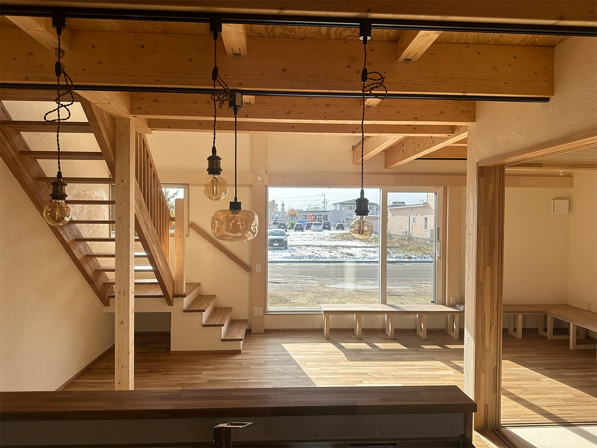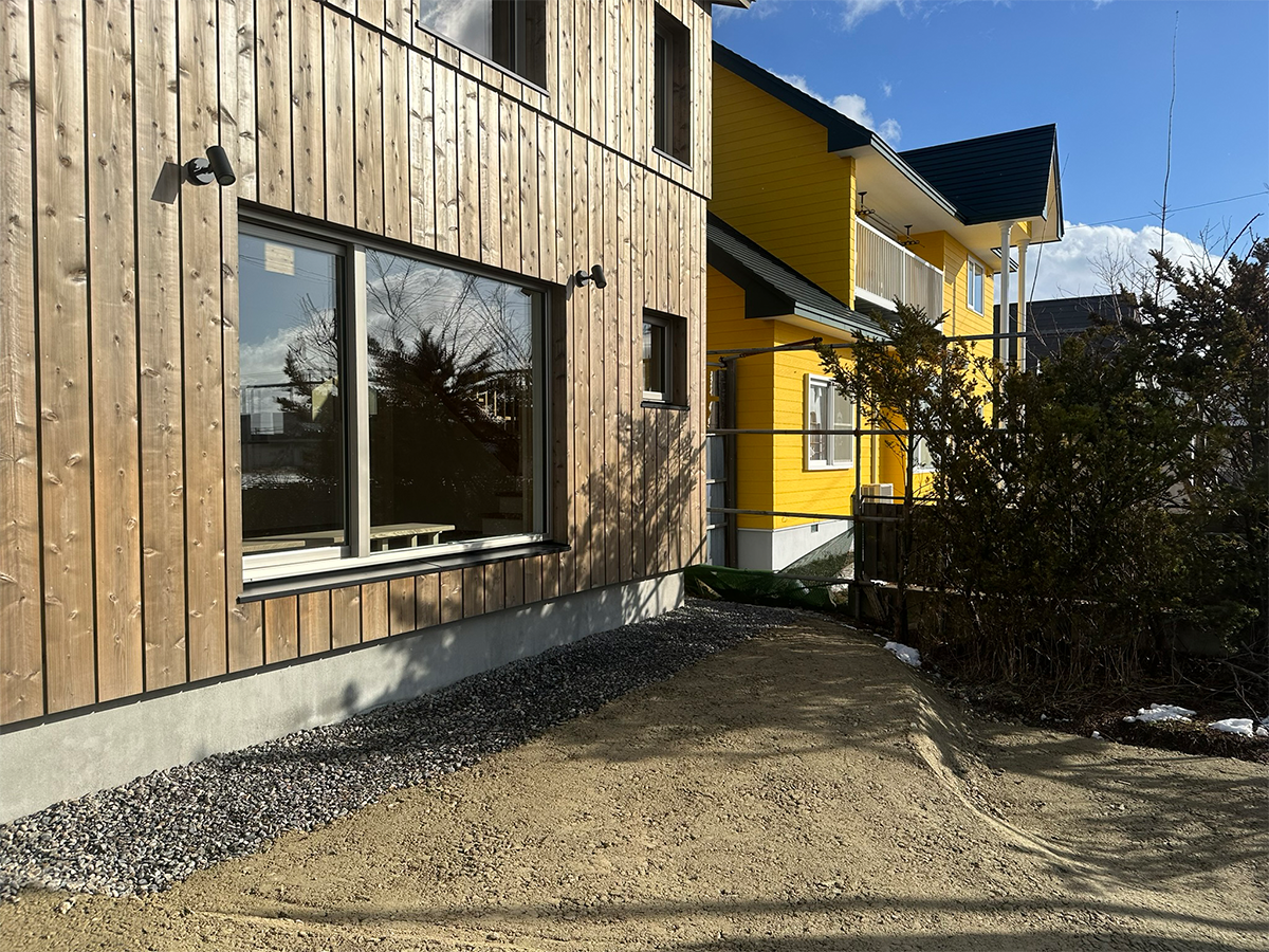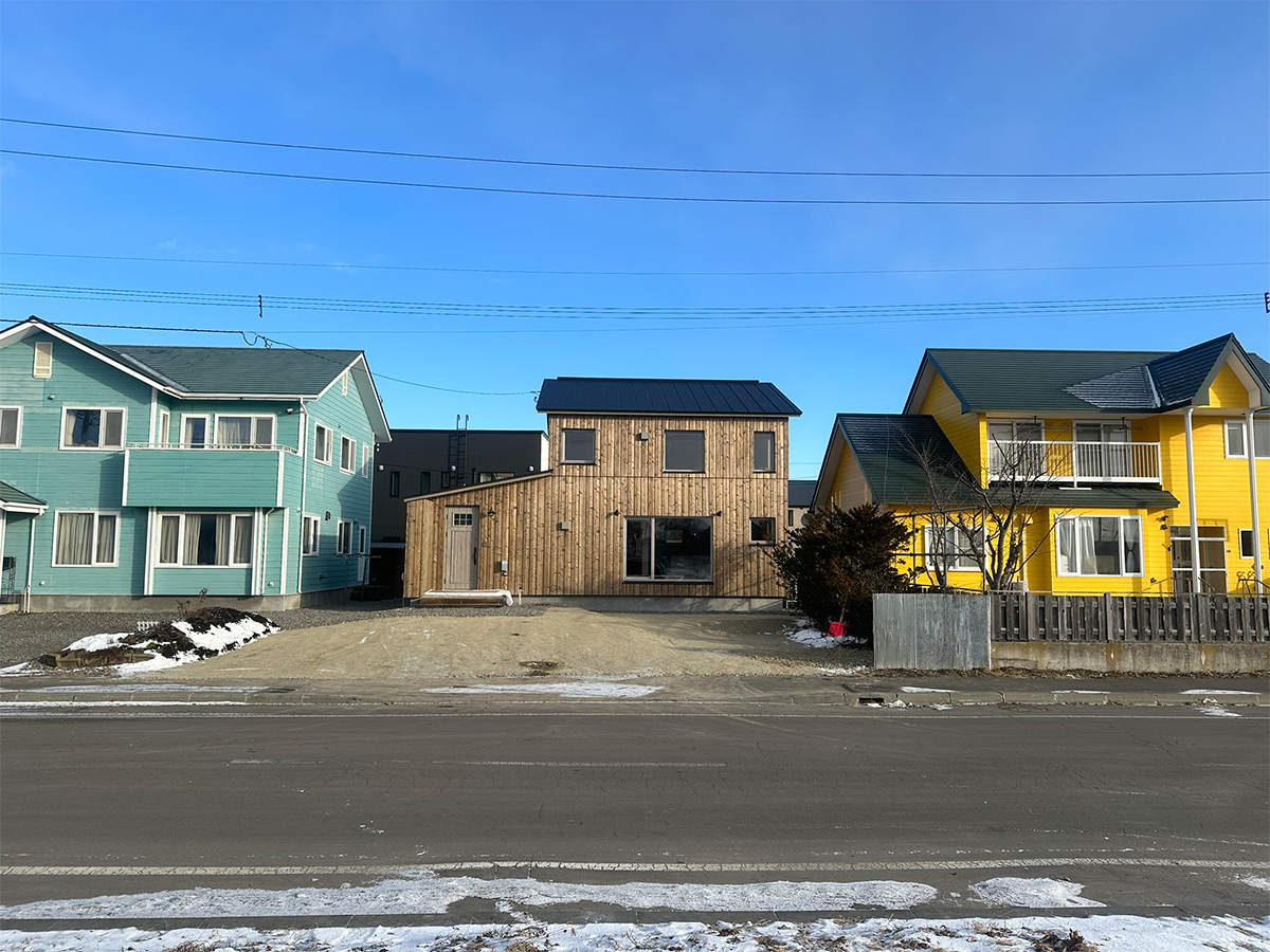 ウッドロングエコを塗った道南杉を大和張りしました。これはメンテナンスがほぼ不要です。通気も格子状に組んでいるので、空気がまわり縦張りであるので雨水も切れやすいです。また悪くなったところのみを取り換えることが可能です。