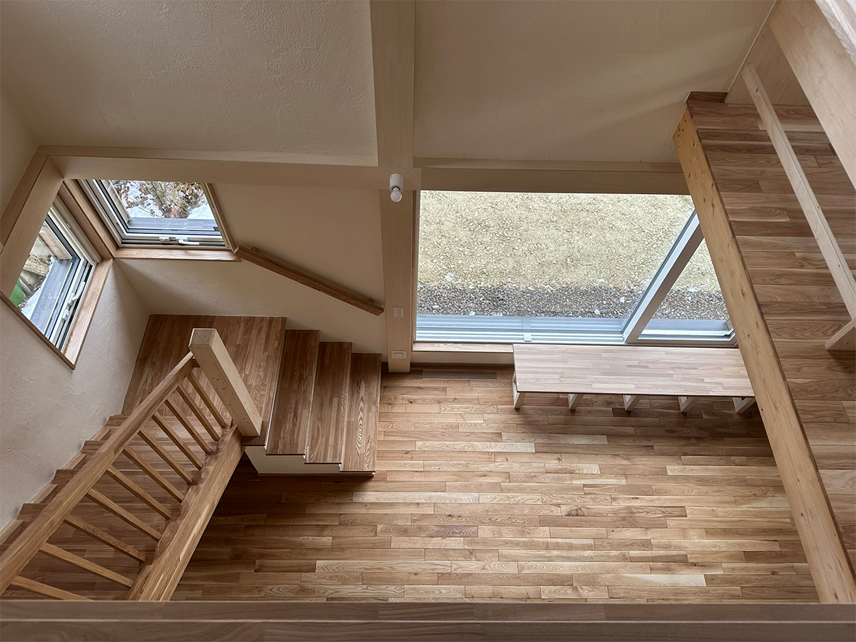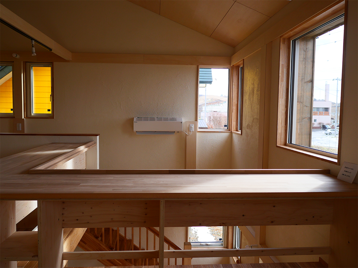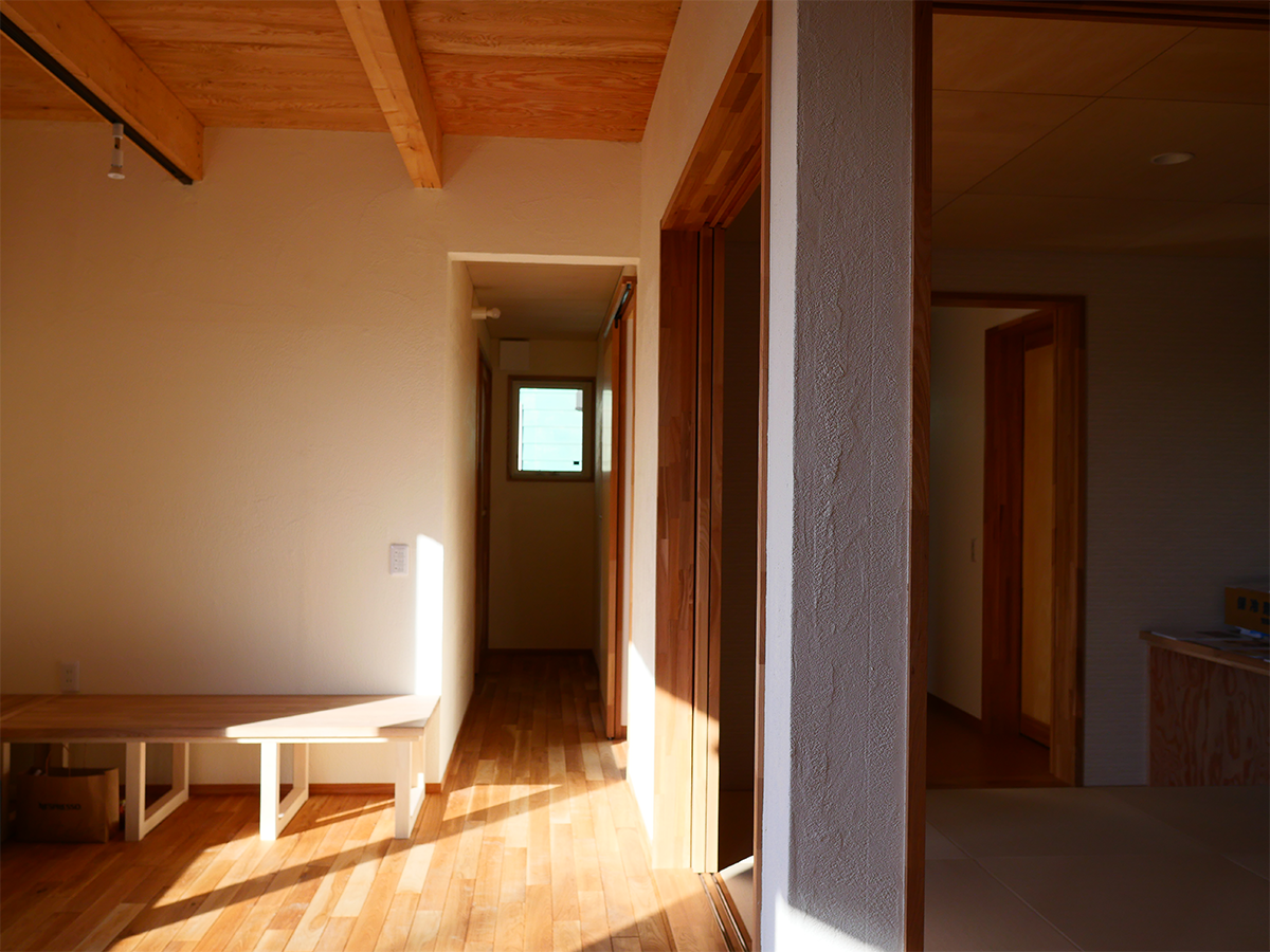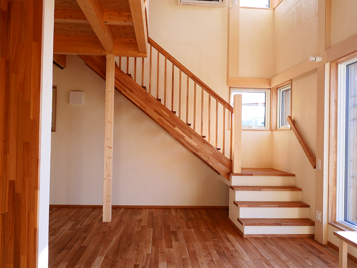 また、電線を壁の中に入れないようにしています。電線の対応年数は30年です。電線に不具合が生じた場合に壁を破る必要がでますが、壁に入れないでボックスの中に入れています。ボックスはシナベニヤとしています。梁や2階の床も見せており、天井にもシナベニアを張っていますので木と漆喰に囲まれた室内となっています。