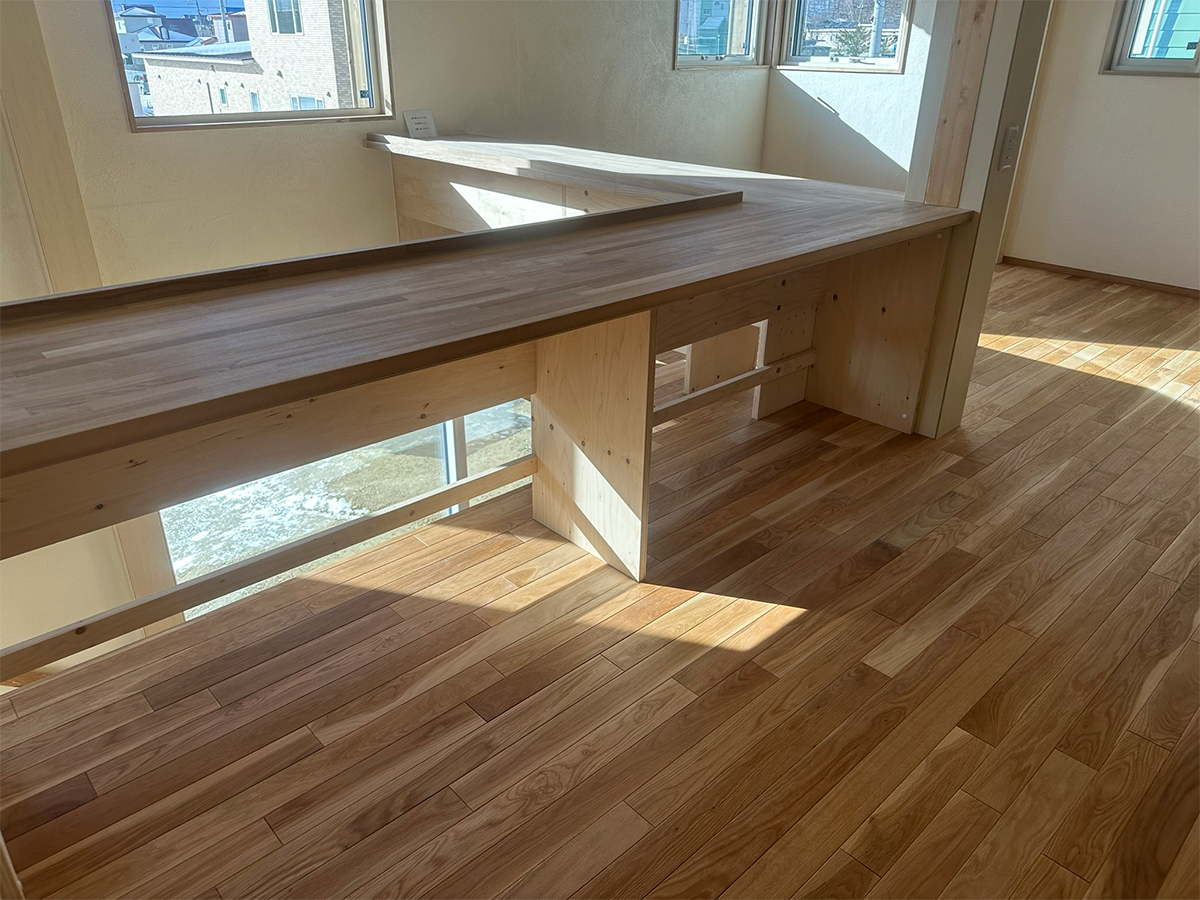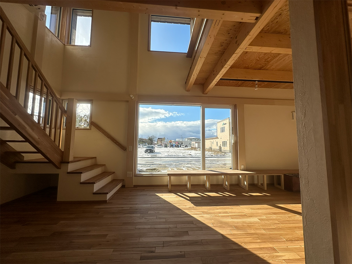 内装においては洗面脱衣室以外はほたて漆喰塗りとしました。ほたて漆喰は伊達でつくられている廃棄されるホタテの貝殻からつくられています。消臭力や吸放出をするので室内環境を良質に保ちます。また、光りの拡散がクロスとは異なるため採用しています。廃番などがなく、汚れた場合メラミンスポンジでこすってあげると消えます。外装と一緒で安全性とメンテナンスの観点から長期的にみるとリーズナブルであると言えます。
