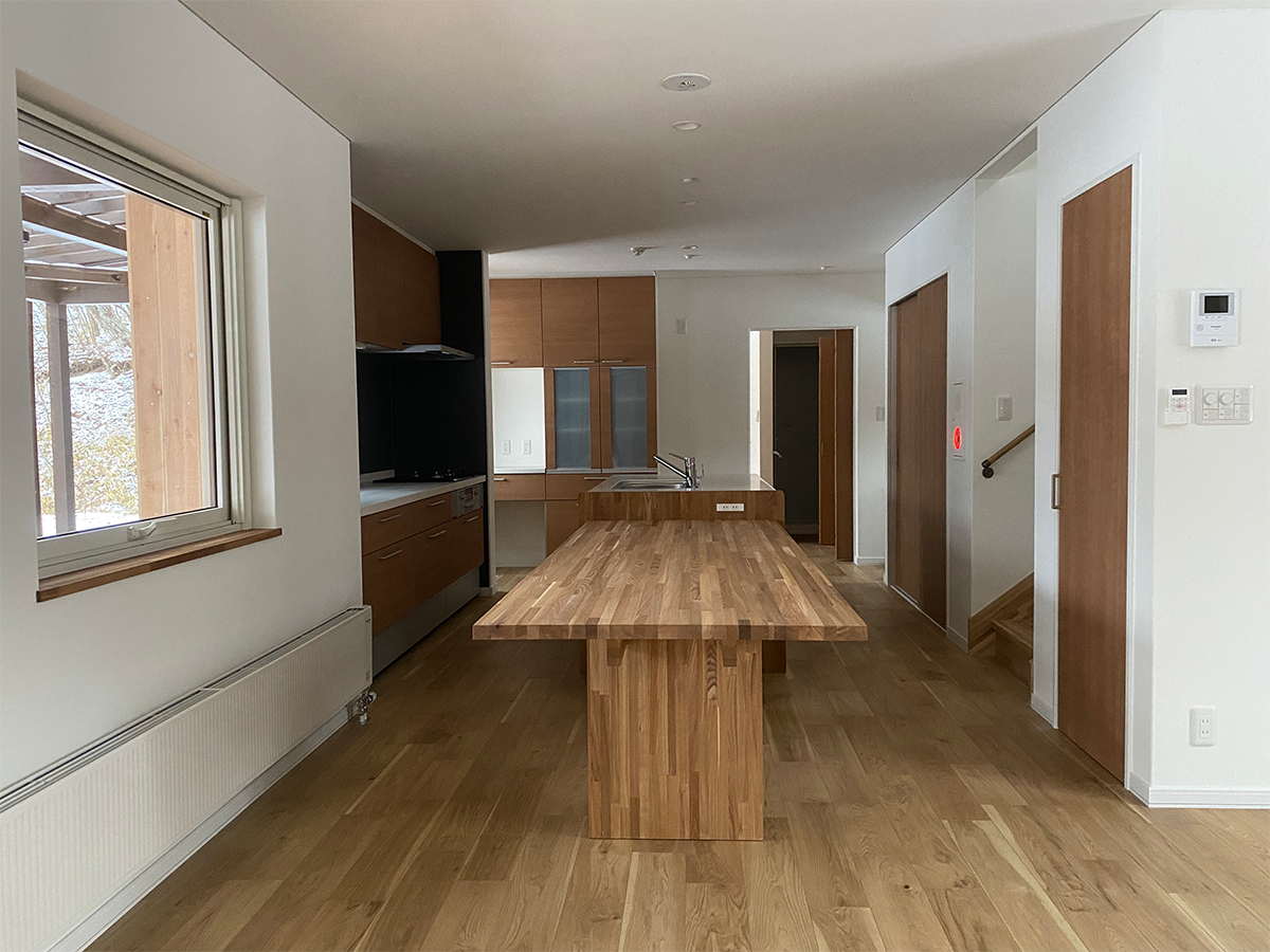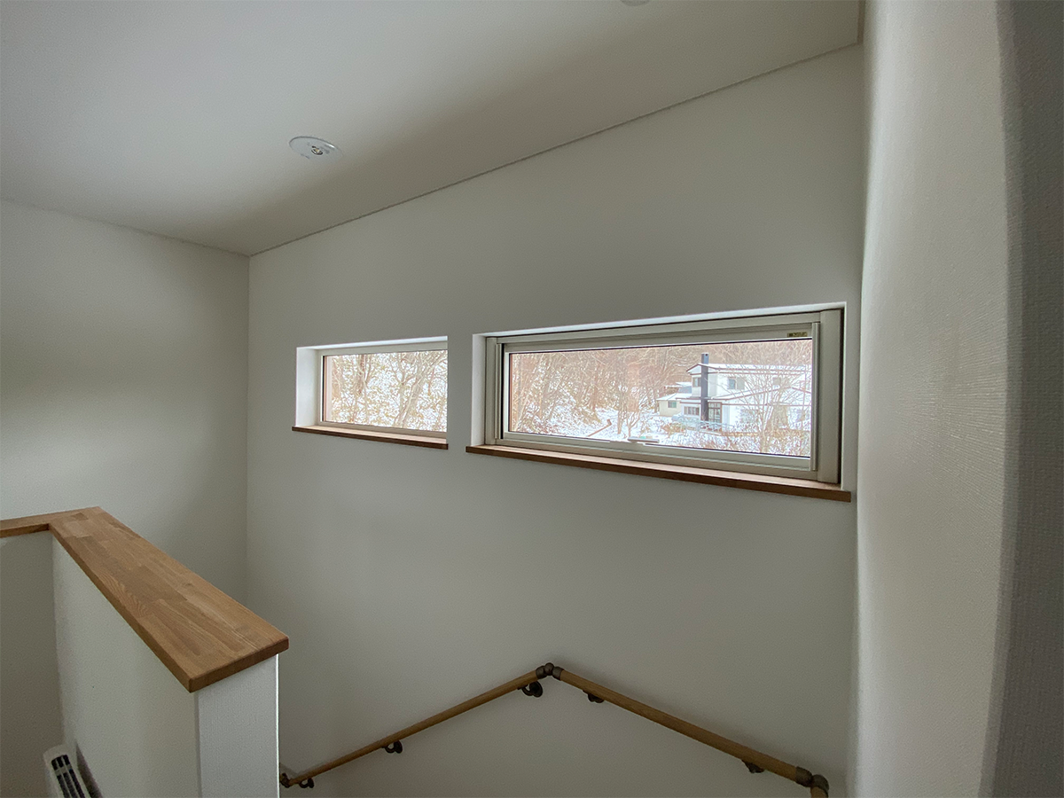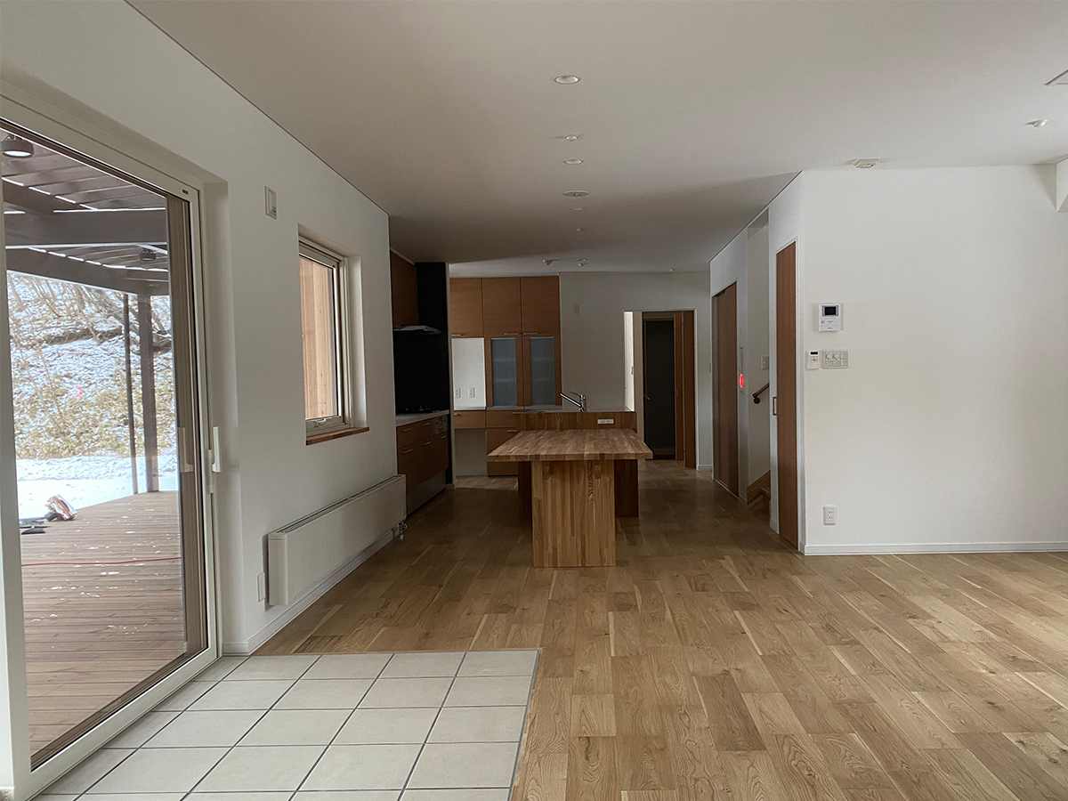 壁は白、床は道産ナラなので特に冬場は外と内がスムーズにつながっている空間となる。