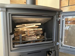 焚き付け材に火がつくよう着火材をセットして火をつけます。ドアは少し開けたままにします。まずは下まできっちり火がつくまで待ちます。コレは煙突を温めて上昇気流をしっかり発生させるため。またその際に酸素を大きく取り込む必要があるためです。