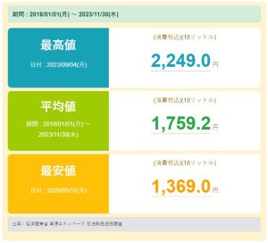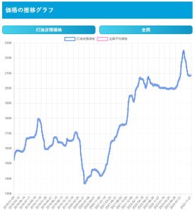ウチでは脱炭素や薪ストーブを推奨しています。今後は化石燃料(灯油やガス)を使うことはドンドン大変になっていきます。日本では電気も火力が83%(2023年3月時点)なので電気料金も同様です。化石燃料はそのほとんどが輸入に頼っていますが、その輸入先からの運送費や円安での徐々に高騰していきます。例えば灯油のこの5年の推移です。