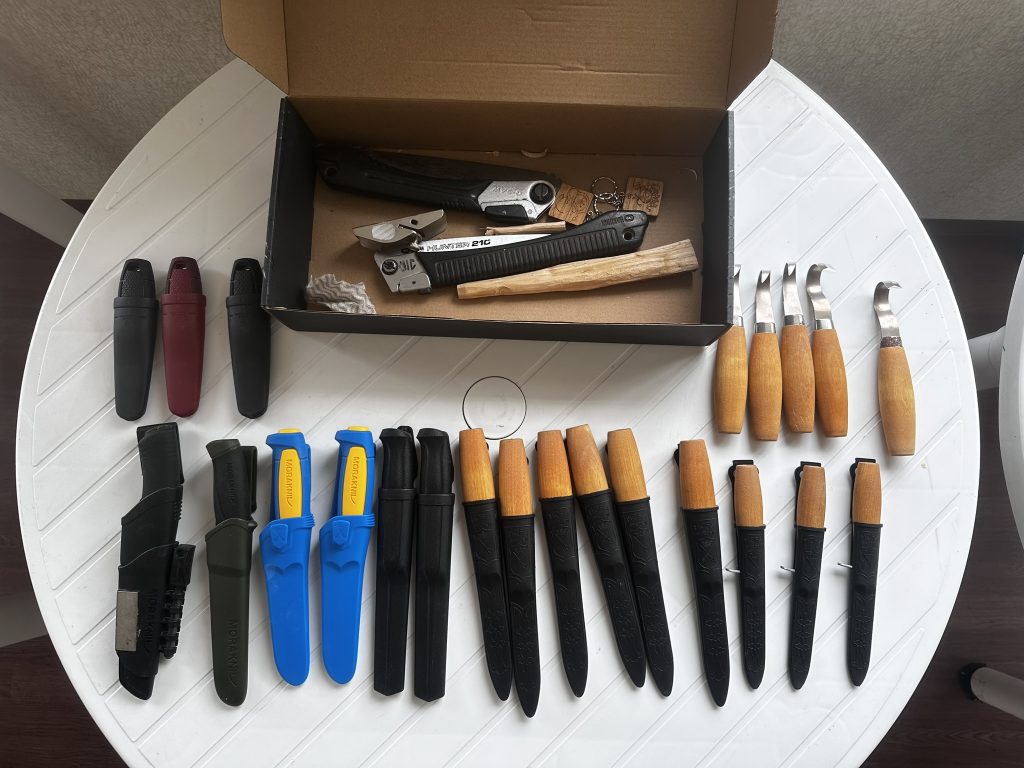 色々な種類のものから自分で選んでもらいます。大きな刃であったり、尖っているもの、丸まっているもの、短いものと自分の手に馴染むや、何となくインスピレーションで選んでもらいます。今回は児童9名、先生3名の12名なので余るのが数本なので取り替えっこしながら削っていました。