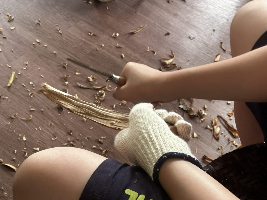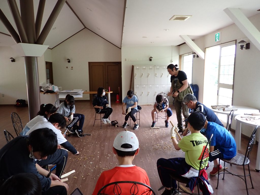 椅子に座って足に固定しながら削る。やった事が少ないと思いますが楽!この形になるまで(知るまで)はテーブルの上でやっていましたが、ムリな形を夢中になっているとやりがち。節の部分を無理矢理とろうとして自分の手に刺す子が3~4人にひとりいましたが、今回は1人。指を切った子。それでもキチンと終えていました。