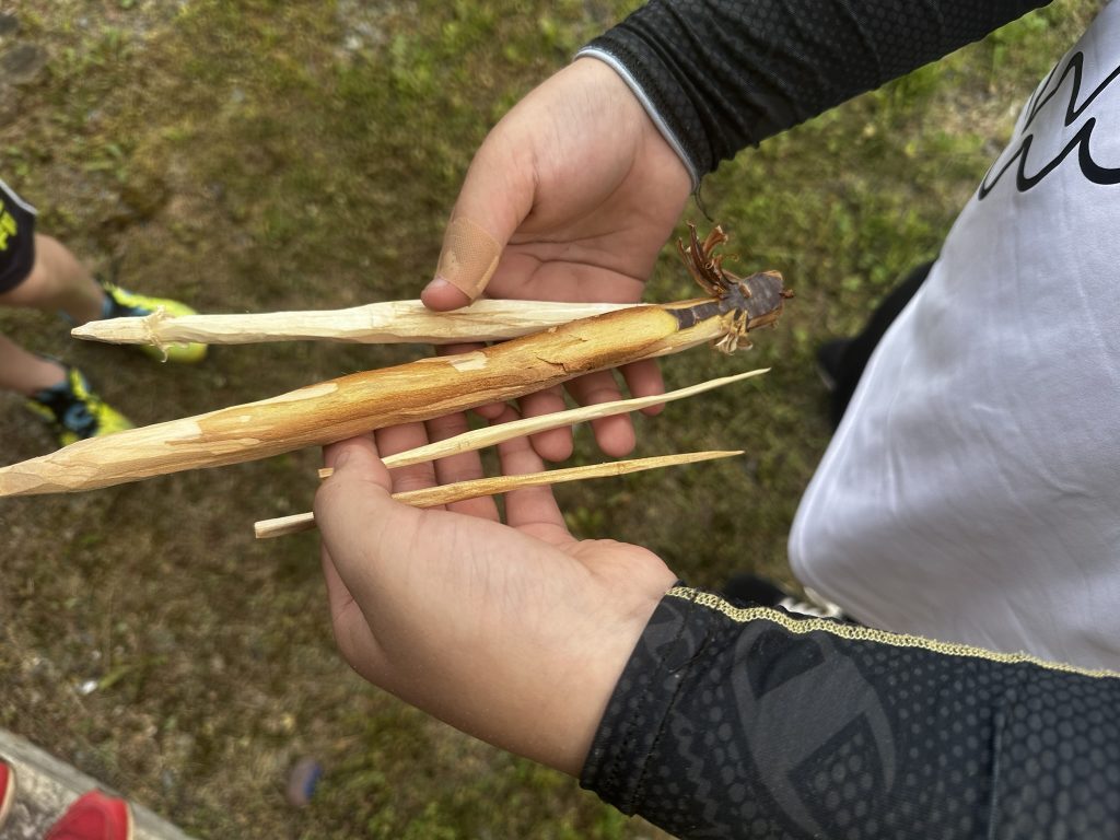 「今からつくる箸で夕食を食べます!できなかったら手で食べる事になりますので完成させるように頑張って削ってくださ~い。では、始め!」のかけ声で始めました。笑