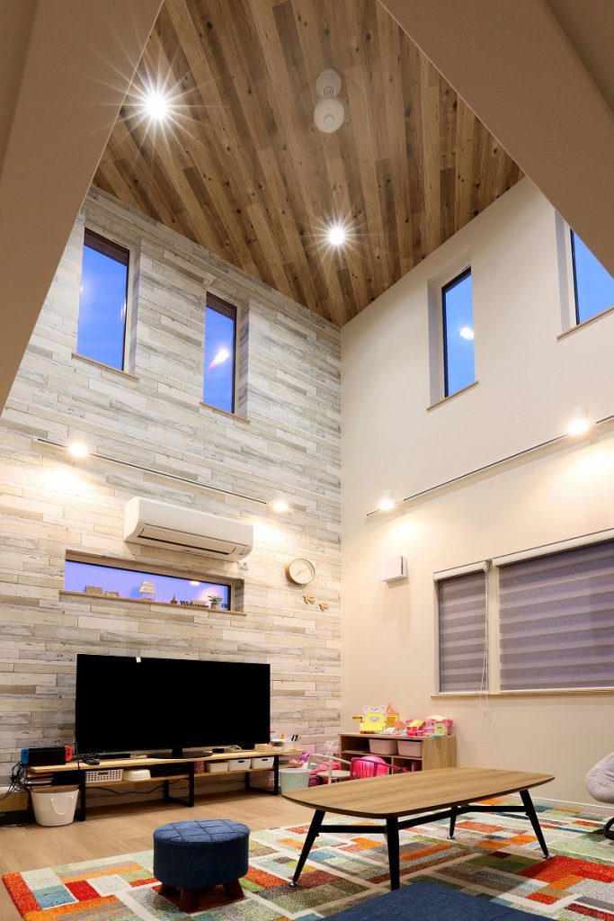 リビングは吹抜けになっており、開放的な空間になっています。住宅街に建つイエのため、窓の多くを高窓にしたことで、採光がしっかりできて、周りの目を気にせず過ごせるイエになりました。